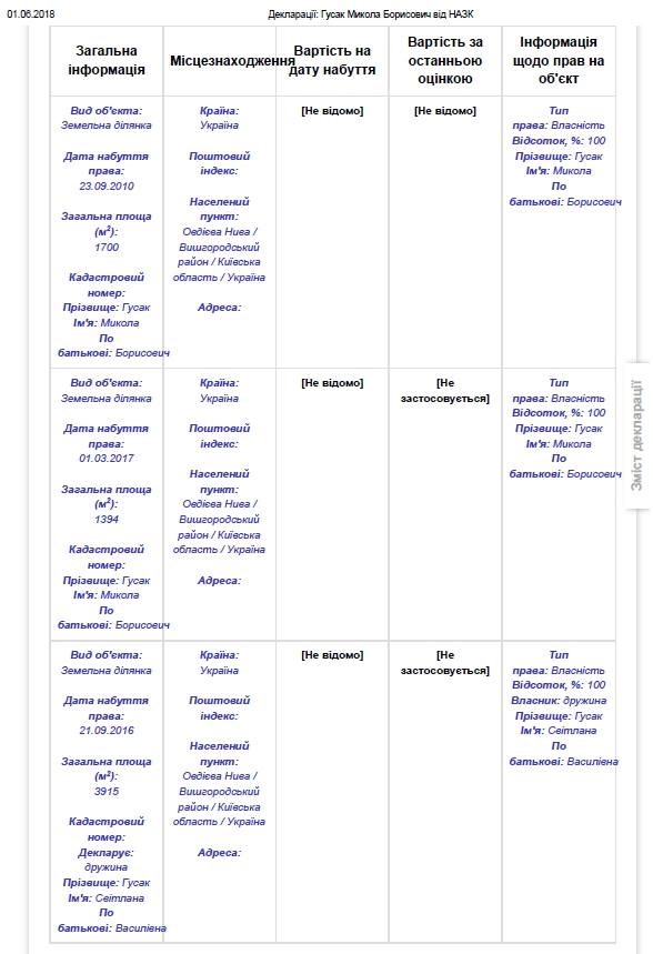 Если заглянуть в декларацию Гусака Николая, членам семьи и ему принадлежат еще три земельных участка, но по явно известным причинам, до 2017 г. Николай Борисович скромно декларировал всего лишь один незначительной площадью 0,17 га.