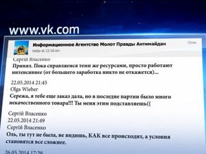 Ольга Вибер: "А вот и я. Наша вторая партия разошлась хорошо, клиенты довольны, появились новые. Судя по новостям, события нам на руку. Как думаешь, курс не изменят?" - "Не предвидится, работать будет с чем! "Наши западные партнеры" своей политикой создают нам хорошие условия и главное - количество! " – отвечает Власенко.