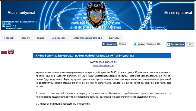 После того, как интернет-пространство Украины было покорено, "Киберберкут" направил все свои силы на более серьезную цель – Германию. Декабрь 2014 года стал для Ангелы Меркель по праву запоминающимся. Именно в декабре хакеры смогли парализовать работу сайта Бундестага и официальную страницу канцлера Германии.