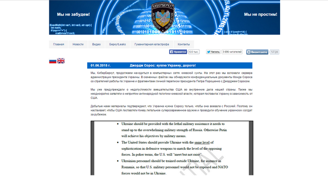 "Добытые нами материалы подтверждают, что Украина нужна Соросу только, чтобы она воевала с Россией. Поэтому он настаивает, чтобы США поставляли Киеву летальное суперсовременное оружие и проводили обучение украинских солдат за рубежом", - отмечается на сайте "Киберберкута".