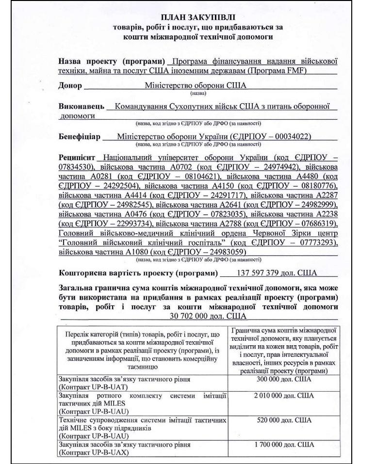 Как выяснилось из обнародованных документов, Министерство обороны Украины запросило у США $30,7 млн в качестве военно-технической помощи. На эти деньги Украина планирует закупить средства связи, в том числе ранцевые радиостанции, системы навигации, системы наблюдения для кораблей береговой охраны, роботы для разминирования, обмундирования и индивидуального снаряжения для военнослужащих; приборы ночного видения и тепловизоры и компьютерное оборудование для Национального университета обороны Украины, сообщает ТАСС.