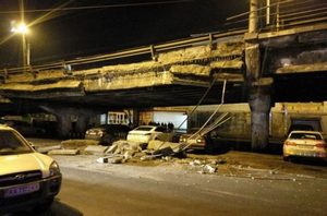 К сожалению, покраска путепровода в готический жовто-блакитный цвет, осуществленная активистами, волонтерами и временно безработными жителями Тернополя, не укрепила несущие конструкции данного произведения позднего совка. Плюс пожар в 2006 году... Знаете, в те времена секонд-хенд еще не называли «качественными европейскими товарами из Европейского Союза». Им торговали не в элитных бутиках, а под мостом. Помню, там был уютный рынок, где внимательные вьетнамцы и те же жители Тернополя делились с киевлянами лайф-хаками: как модно, качественно и по-европейски одеться. К сожалению, в процессе выяснения «кто где стоял» рынок часто горел. Металлические и бетонные конструкции устали от этого безобразия.