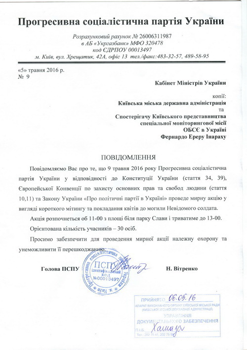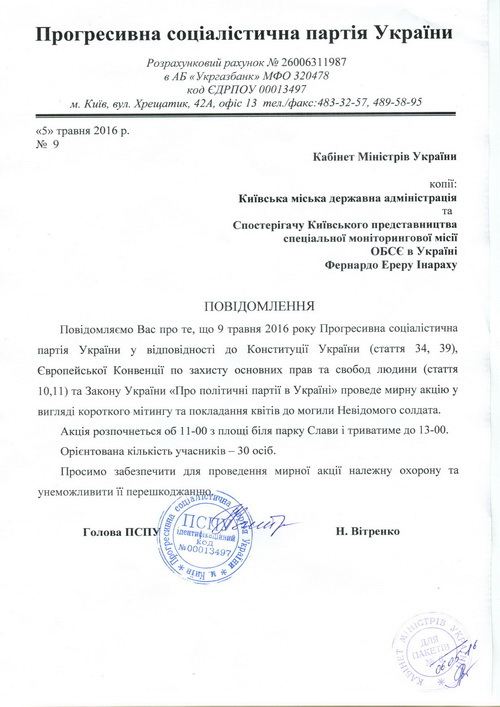 Прогрессивные социалисты о своей акции заранее уведомили Кабинет Министров Украины, Киевскую городскую администрацию и наблюдателей Киевского представительства Специальной мониторинговой миссии ОБСЕ в Украине (см. на фото). Но власть наплевала на конституционные и конвенционные гарантии гражданам и политическим партиям на право проведения мирных акций, натравила на участников законной акции бешенных неонацистов. Государство Украина в лице евромайданной власти не выполнило возложенные на него обязательства по защите прав и свобод человека. Прав и свобод, гарантированных и национальным, и международным правом, в том числе и Соглашением об ассоциации Украины с ЕС.