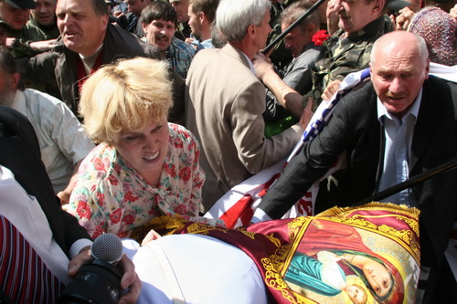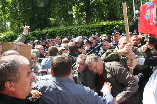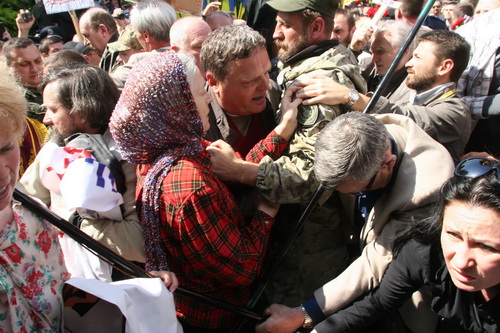 Украинские нацисты при полном бездействии властей перекрыли дорогу участникам акции, а потом, вырывая из наших рук флаги, баннеры и хоругвы, начали драку. Всё это с их стороны сопровождалось омерзительным матом. В условиях давки лидера ПСПУ Наталия Витренко, как и нескольких других женщин и мужчин, повалили наземь. Некоторые из участников акции получили травмы.
