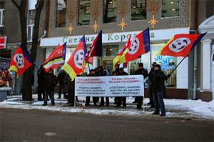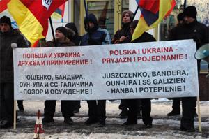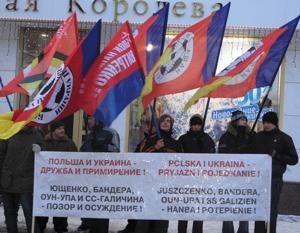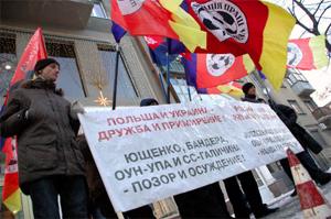 "Мы проводим пикет в знак поддержки польского народа против президент Ющенко, который своим указом опозорил звание Героя Украины. Мы требуем, чтобы Ющенко прекратил реабилитацию фашизма", - заявил Цымбалюк.