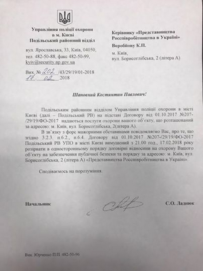 "В связи с форс-мажорными обстоятельствами сообщаем о разрыве договора об охране вашей организации по адресу улица Борисоглебская, 2 с 21:00 17 февраля в одностороннем порядке", - говорится в письме на имя руководителя представительства Россотрудничества в Киеве Константина Воробьева.