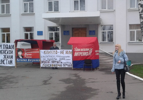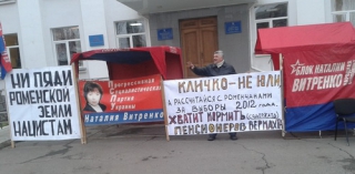 Возле горисполкома мы выставили плакат "Кличко – не юли, а рассчитайся с роменчанами за выборы 2012 года, хватит кормить (содержать) пенсионеров Вермахта".