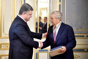 Президент Украины Петр Порошенко наградил американского инвестора Джорджа Сороса орденом Свободы. Презедент сказал : ,,Для меня большая честь вручить эту высокую награду человеку , чья активная деятельность в течение последних лет чрезвычайно способствовала демократическим изменениям, которые сейчас происходят в Украине".