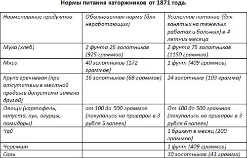 Долгое время в Российской империи питание каторжан никак не регламентировалось, как и чем их кормить, решали местные власти. Первым централизованным нормативным актом об этом стало "Положение о провиантском и приварочном снабжении войск", появившееся в 1871-м году. Распространялось положение и на каторжников. В соответствии с ним неработающим полагалось в сутки 925 граммов хлеба, 172 грамма мяса и 68 граммов крупы. Норма для больных и занятых на тяжелых работах была существенно выше – хлеба уже 1150 граммов, мяса и черемши (родственник чеснока) – по 409 граммов, и крупы 103 грамма в сутки. Кроме того этого им был положен чай и соль, помимо той, что использовалась при приготовлении пищи. Овощи покупались дополнительно из расчета "приварочных" 3 рублей 5 копеек. К слову, в Киеве в 1914 году кило картошки стоило 3 копейки, а кочан капусты 5 копеек. Правда, стоит учитывать, что в северных и дальневосточных районах империи, где традиционно размещались каторжные тюрьмы, цены на все были несколько выше. Калорийность такого питания составляла 2500 килокалорий для неработающих и 3700 для работающих и больных.