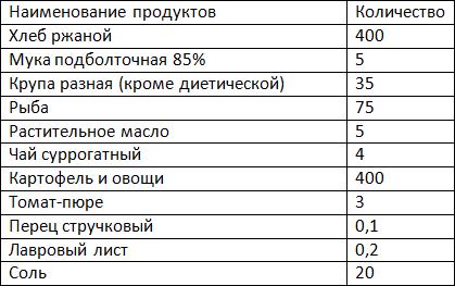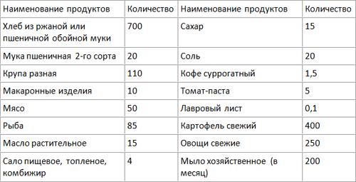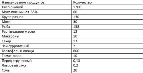В общую суточную норму входят 500 граммов хлеба, 120 граммов круп, по 100 граммов мяса и рыбы, 500 - картофеля, 250 – овощей, 40 – жиров, 30 – сахара и 1 грамм чая. В итоге это 2500 калорий.
