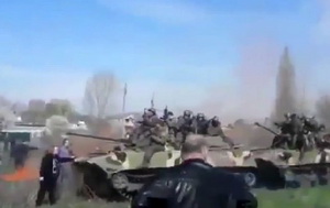 Украинские военные пытались прорваться сквозь окружение местных пророссийских активистов в Краматорске, однако перед одной из машин встала женщина, вытянув вперед руку, чтобы остановить экипаж.