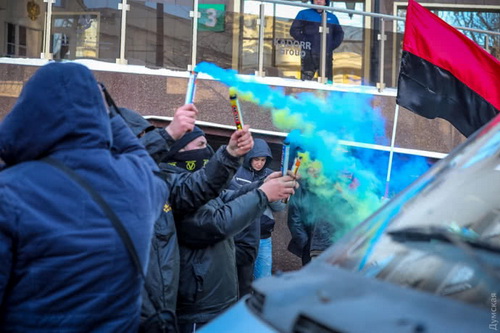 Активісти палили фаєри, кидали їх через паркан дипустанови, співали державний гімн та облили паркан консульства червоною фарбою.