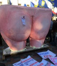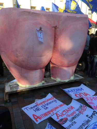Каждый раз случается нечто необычное. То заловят коррупционера Журавского и посадят в мусорный бак, то притащат двести килограммов жутко прочных помидоров, чтобы забросать депутатов, не желающих бороться со взяточничеством. На этот раз к Раде притащили большую, розовую жопу из папье-маше без первичных половых признаков. То есть сзади это реально жопа, причем выполненная со знанием дела, можно даже сказать, с любовью к эротическому искусству.