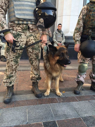 Думаю, в скором времени я бы стал там главным кассиром, поскольку наладил логистику процесса, но пришлось прерваться. Хотелось еще внутрь попасть. Сам парламент, аккурат перед гигантской жопой, был в тройном оцеплении Национальной гвардии. Еще четыре "слоя" силовиков в светлом камуфляже и брониках расположились непосредственно перед зданием. Всех шмонали, и была даже собака по кличке Федор, которая обнюхивала посетителей на предмет наличия посторонних предметов и жидкостей. С Федором мы подружились, поскольку он был достаточно дружелюбен и охотно позировал.