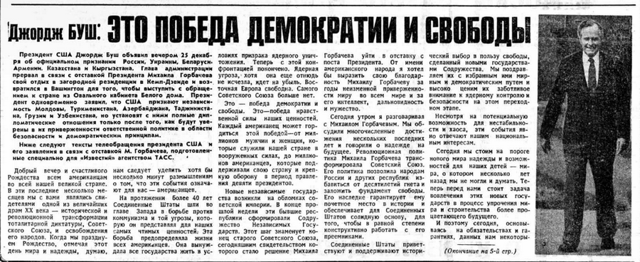 И глубоко закономерно, что беловежские подписанты (трое из шести) отправились отмечать 25 лет развала их руками Советского Союза в США. 25 декабря 1991 года тогдашний президент США Джордж Буш-старший официально объявил о признании независимых государств, в первую очередь России, Украины, Беларуси, Армении, Казахстана и Кыргызстана. Развал СССР он назвал «победой демократии и свободы», «победой нравственной силы наших ценностей» и заявил, что «каждый американец может гордиться этой победой». Буш поприветствовал государства, учреждённые на обломках СССР, и отметил: «Несмотря на потенциальную возможность для нестабильности и хаоса, эти события явно отвечают нашим национальным интересам».