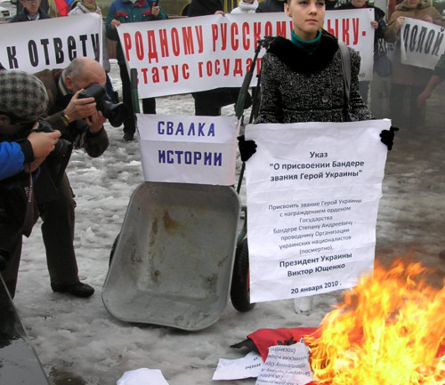 По команде председателя организации "Молодая гвардия" Сергея Стаднюка к свалке истории были снесены и сожжены флаги ОУН-УПА.