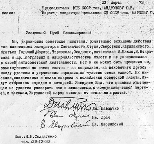 Нельзя исключать возможную в перспективе инициативу И. Драча, В. Яворивского и Д. Павлычко о приеме нынешнего президента Виктора Януковича в ряды членов союза писателей. Опыт тройственного служения истине у них уже имеется. В 1973 г. они уже подписывали втроем документ, который иначе как шедевром коллективного творчества и торжества партийной принципиальности назвать весьма сложно.