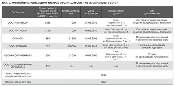 Больше всего усиливает ощущение исключительно "прозрачной" схемы портрет ключевых партнеров - поставщиков неизвестных товаров и услуг, которыми в 2012 г. пользовалось ООО "Газ Украина 2020". С ними, а также с их краткой (в прямом смысле слова) биографией можно познакомиться в табл. 2.