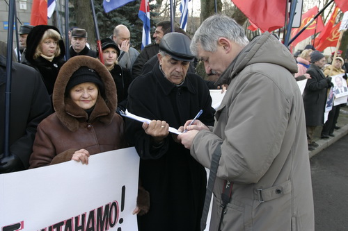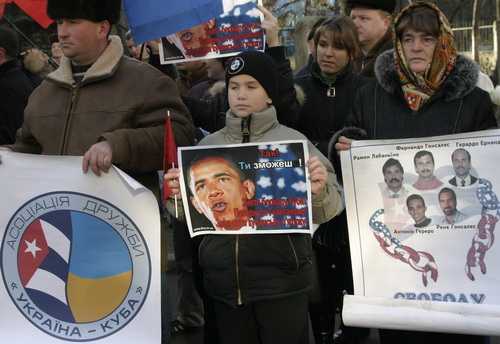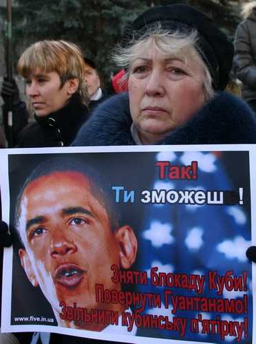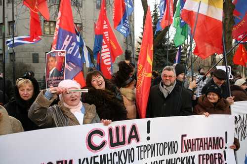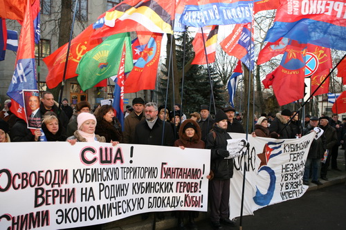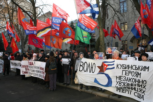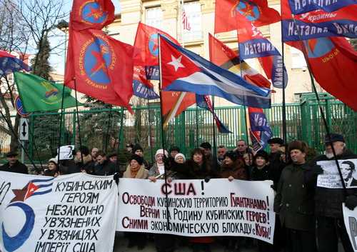 11 февраля под стенами посольства США в Украине собралось несколько сот человек, чтобы выразить свой протест против многолетней экономической блокады героического острова Куба, против аннексии американцами части кубинской территории, на которой находится военная база США и печально известная тюрьма Гуантанамо. Кроме этого манифестанты потребовали от властей США незамедлительного освобождения пяти кубинских патриотов, уже более десяти лет томящихся в американской тюрьме только за то, что они раскрыли террористический заговор антикубинских организаций.