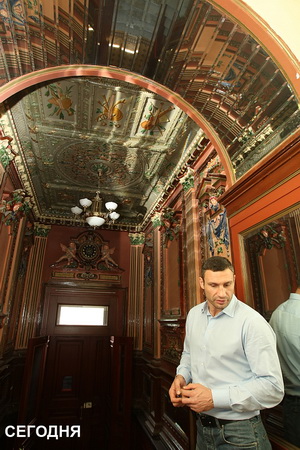 Теперь – о владениях Виталия Кличко. Он живет в центре Киева на ул. Богдана Хмельницкого – в старинном шестиэтажном здании в классическом стиле, построенном в 1901 году. На первом этаже сохранились декоративная резьба по дереву и лепнина, напоминающие царские времена. В квартире три уровня, шесть жилых комнат, четыре ванных и туалета. Общая площадь – 225 кв. м. Большую часть квартиры занимают две гостиные. Над одной из них пристроена библиотека с прозрачным полом из закаленного стекла. На верхнем уровне – кабинет хозяина квартиры, а в самом низу – три спальни.
