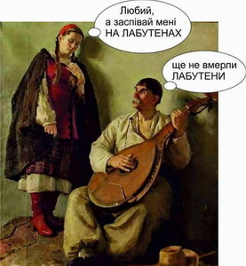 Стихотворение сопровождается известной украинской иллюстрацией на современный лад.- Любимый, а спой мне «на лабутенах», - просит девушка.В ответ музыкант затягивает «олабутененный» гимн Украины.