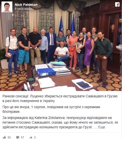 «Генпрокурор, відповідаючи на питання стосовно Саакашвілі, сказав, що йому нічого не залишиться, як здійснити екстрадицію колишнього президента до Грузії», – написав журналіст Микола Фельдман.