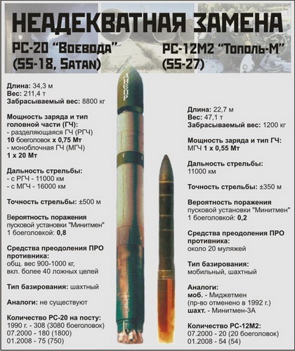 В первую очередь потому, что нынешней властью в РФ уничтожается основа её стратегической безопасности - ракеты РС-20 Воевода (SS 18, Satan), не имеющие аналогов в мире, несущие до 10 боеголовок и ещё 40 ложных целей и множество средств преодоления ПРО (в сумме около 900-1000 кг в весовом эквиваленте). Против этой самой мощной и тяжелой ракеты в мире пока бессильна вся система американской противоракетной обороны. По признанию многих экспертов, разработчиков ракеты, а также командующих РВСН, ракета Воевода до сих пор является современной ракетой и вполне прослужит до 2020 г., а может и дольше. Правда, вместо модернизации Воеводы, её продолжают уничтожать и взрывать пусковые шахты. Всё это делается под предлогом ввода в строй совершенно неадекватной замены - в десятки раз более слабых шахтных и мобильных ракет "Тополь-М" РС-12М2 с 1 боеголовкой (в последнее время заговорили и о ракете, созданной на базе Тополя-М - РС-24, характеристики по которой пока засекречены и которая находится на стадии испытаний). При этом мобильность, за которую все хвалят "Тополь-М", вряд ли можно назвать сильным преимуществом, потому как боеголовки все равно обнаруживаются американскими спутниками серии "Лакросс", а в шахтах держать их вместо заведомо более мощной тяжелой ракеты просто глупо (мобильных комплексов Тополь-М сейчас стоит на вооружении 6 шт., шахтных - 48). Ведь способностей преодоления ПРО противника у "Тополя-М" по сравнению с "Воеводой" заведомо гораздо меньше.