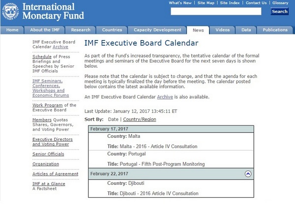 Ближайшие заседания Совета директоров запланированы на 17 и 22 февраля. 17 февраля МВФ рассмотрит вопросы сотрудничества с Мальтой и Португалией, 22 февраля – с Джибути. При этом в фонде предупреждают, что повестка дня заседаний Совета директоров может измениться.