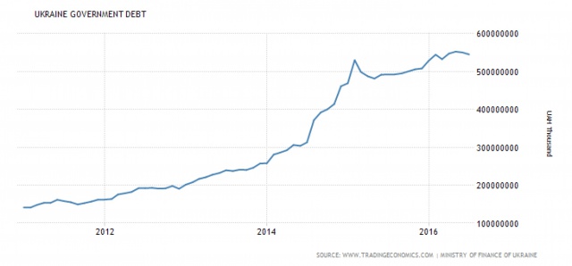 Украина намерена в 2017 г. направить на погашение госдолга более 240 млрд гривен (около $9,2 млрд по текущему курсу Нацбанка Украины), в том числе 72 млрд гривен ($2,8 млрд) пойдут на выплаты по внешнему долгу согласно проекту бюджета-2017.