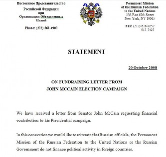 Разоблачительный портал Викиликс опубликовал письмо конгрессмена Джона Маккейна постоянному представительству России при ООН с предложением профинансировать его предвыборную кампанию. Письмо датировано 2008-м годом. Кроме того, опубликован и ответ российских властей сенатору-попрошайке.