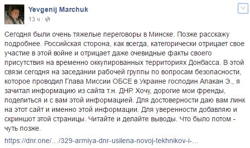 "Сегодня были очень тяжелые переговоры в Минске ... На заседании рабочей группы по вопросам безопасности ... я зачитал информацию из сайта т.н. ДНР", - написал экс-генерал СБУ в своем Facebook.