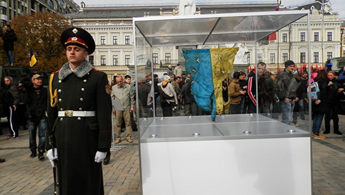 Митинг на Михайловской площади начался с минуты молчания в память по погибшим на Майдане бойцам «Небесной сотни», солдатам и офицерам АТО.