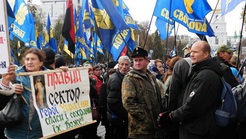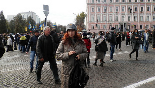 - У меня квартира возле СИЗО, - поделилась переживаниями пожилая киевлянка. - Лишь бы квартиру мою не подожгли. Ненавижу эту шваль бандеровскую, - и тут же осеклась, так как увидела, что к ней вплотную подошли со спины бойцы «Правого сектора» и начали угрожать расправой. Женщина замолчала и испуганно поспешила к метро. Ей вслед тут же крикнула другая женщина: