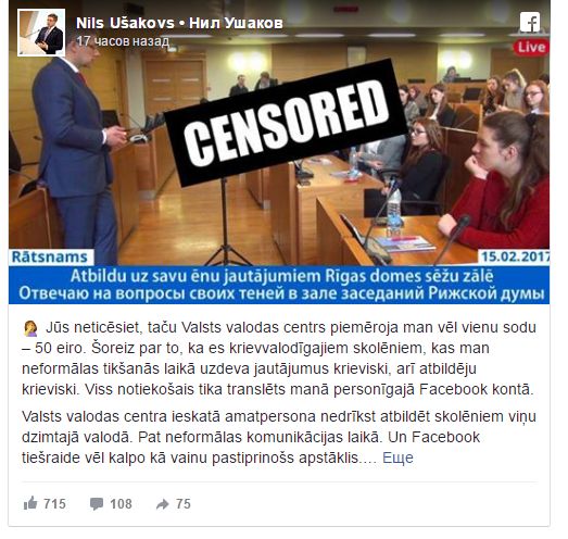 "По мнению ЦГЯ, должностное лицо не может отвечать школьникам на их родном языке. Даже во время неформального общения. А факт трансляции в Facebook является еще и отягощающим фактом. Даже несмотря на то, что это моя личная страница", - добавил политик. Это решение ЦГЯ мэр Риги намерен оспорить в суде. "Закон о госязыке не регулирует неформальное общение, то есть и закон я не нарушал. Соответственно штраф будет оспорен в суде. Если надо - то и в Конституционном суде", - указал он.