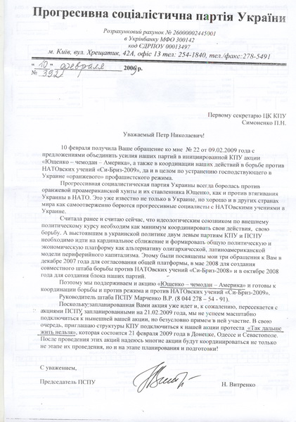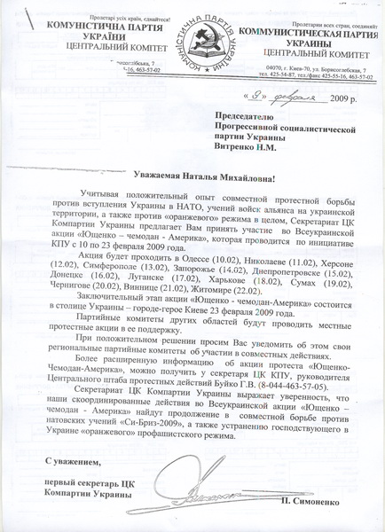10 февраля получила Ваше обращение ко мне N 22 от 09.02.2009 года с предложениями объединить усилия наших партий в инициированной КПУ акции "Ющенко - чемодан - Америка", а также в координации наших действий в борьбе против НАТОвских учений "Си-Бриз-2009", да и в целом по устранению господствующего в Украине "оранжевого" профашистского режима.