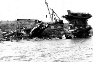 Но на строительстве моста через Русановский проток, произошла серьезная авария. К счастью это случилось ночью, около 4-х часов утра, когда строительно-монтажные работы не проводились. Человеческих жертв не было. Но падение 52-х метрового, 700 тонного шашлыка, состоящего из 17 элементов коробчатого сечения, по 40 тонн каждый, это не рядовая авария. Причина - смятие бетона на "сухом стыке", подмороженном при изготовлении. Нужно помнить, что все мощные ж/б конструкции изготавливались на специальном полигоне, а к месту монтажа их привозили уже готовыми. Для нас не составляло большой проблемы изготовить и смонтировать новые блоки, восстановив разрушенный пролет моста. А вот как очистить перекрытое русло реки от 40-тон-х. ж/б коробок, стало проблемой. Выручили военные. Блоки по одному крепились тросами и танками вытягивались на берег.