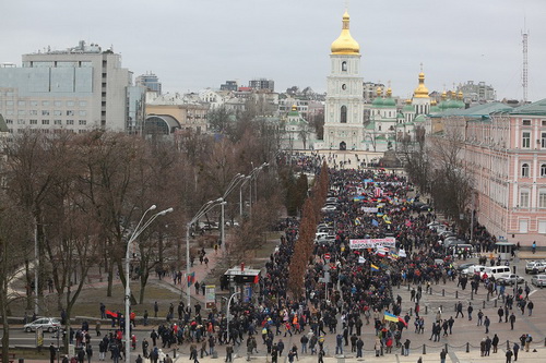 «Маршировать за будущее» (новое название акций, вместо «Марша за импичмент») пришли около 5 тысяч человек: как и раньше, стартовали у памятника Тарасу Шевченко. Из новшеств - белые палатки, маркированные «і» («імпічмент»), - в них предлагалось передавать пожертвования и личные контакты (для информирования об акциях в случае «перекрытия официальных каналов и «Фейсбука»). К красно-черным знаменам ОУН и традиционным уже грузинским флагам добавилось звездно-полосатое знамя США, кокетливо свисавшее у самой сцены на Европейской площади. США поддерживают нас, толкают реформы - их флаг имеет такое же право быть, как остальные рассказал активист Михаил, державший знамя.