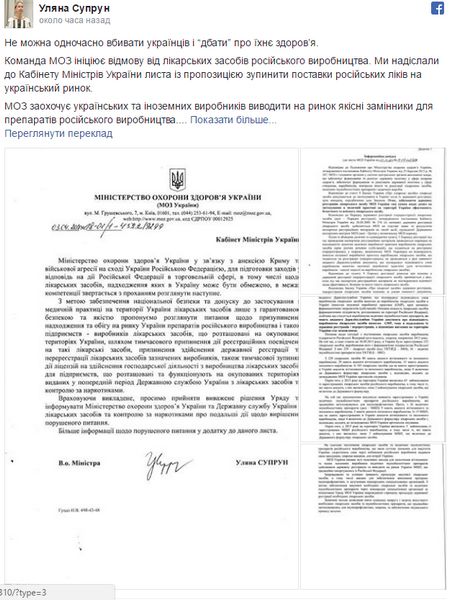 "Команда Минздрава инициирует отказ от лекарственных средств российского производства. Мы направили в Кабинет Министров Украины письмо с предложением остановить поставки российских лекарств на украинский рынок. Минздрав призывает украинских и иностранных производителей выводить на рынок качественные заменители для препаратов российского производства", - написала Супрун.