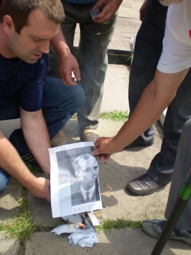 Были порваны и сожжены портреты нелюдей, лизавших немецкие сапоги, убийц - Бандеры и Шухевича. Их прах и сегодня горит в адском огне. Нет и никогда не будет прощения их злодеяниям!