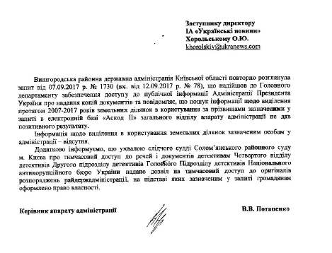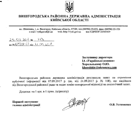 Ранее Українські Новини обращались в Вышгородский районный совет и Вышгородскую РГА с просьбой предоставить копии документов, на основании которых в 2007-2017 годах получали право собственности на землю 7 человек – Олег Ляшко, члены его семьи и его соратники (с указанием конкретных имен и фамилий).