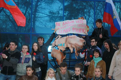 В Евпатории активисты Крымской молодежной организации "Прорыв" в качестве наглядности использовали, сваренный из металла глобус с кровавыми отметками на контурах тех стран, где "поработало" НАТО.