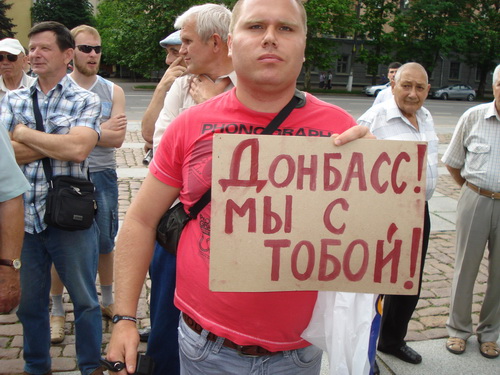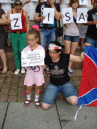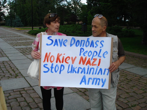 Часть активистов выстроилась в ряды у постамента с плакатами-буквами, которые складывались в общую надпись: "SAVE DONBASS PEOPLE FROM UKRAINIAN ARMY", что в переводе означает "Спасите жителей Донбасса от украинской армии!".