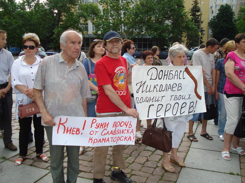 Другие участники держали баннера "Нет карательной операции на Донбассе", а также плакаты с надписями: "Нет войне, нет фашизму!", "Киев, руки прочь от Славянска и Краматорска!", "Донбасс, Николаев помнит твоих героев!", "Не смей стрелять по садикам и школам!" и другими.