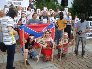 Кульминацией акции стала инсталляция, организаторы которой "в картинке" изобразили собственное видение событий, происходящих на востоке страны. Несколько участниц сидели за колючей проволокой. Над ними стояли "каратели" в черных масках, в руках они держали некое подобие маузеров времен гражданской войны 20-х годов минувшего столетия. Далее женщины взбунтовались, отняли у "карателей" оружие, повалили ограждение с колючей проволокой, ознаменовав, тем самым, победу над террором.После перформанса состоялся митинг. Дмитрий Никонов ПСПУ охарактеризовал проводимую на Востоке антитеррористическую операцию как "карательную", поскольку, по его мнению, суть ее сводится к уничтожению мирного населения.