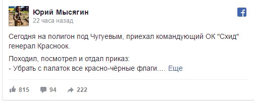 Начальник штаба оперативного командования Восток Вооруженных сил Украины генерал-майор Александр Красноок на полигоне под Чугуевым, где расположена 54 бригада ВСУ, приказал убрать с палаток военных все красно-черные флаги. Об этом сообщил волонтер Юрий Мысягин на своей странице в Facebook.