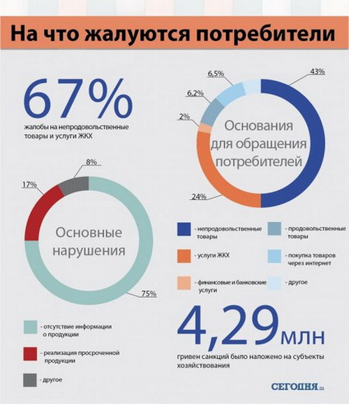 "Основания для обращения потребителей: непродовольственные товары – 43%, качество услуг ЖКХ – 24%, финансовые и банковские услуги – 2%, качество продовольственных товаров – 6,2%, приобретение товаров через интернет – 6,5%, другие причины – 4%", – сообщил Лапа.