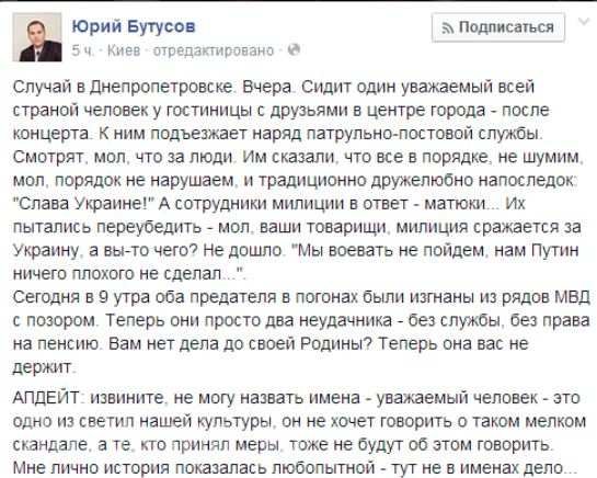"Случай в Днепропетровске. Вчера. Сидит один уважаемый всей страной человек у гостиницы с друзьями в центре города - после концерта. К ним подъезжает наряд патрульно-постовой службы. Смотрят, мол, что за люди. Им сказали, что все в порядке, не шумим, мол, порядок не нарушаем, и традиционно дружелюбно напоследок: "Слава Украине!" А сотрудники милиции в ответ - матюки... Их пытались переубедить - мол, ваши товарищи, милиция сражается за Украину, а вы-то чего? Не дошло. "Мы воевать не пойдем, нам Путин ничего плохого не сделал...".