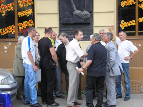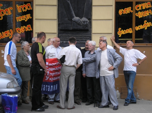 1) Прогрессивные социалисты Львова и их сторонники после возложения цветов к мемориальной доске погибшим 22.06.1941 г. прогрессивным украинским писателям-коммунистам Степану Тудору и Александру Гаврилюку, г. Львов, 22.06.2011 г.