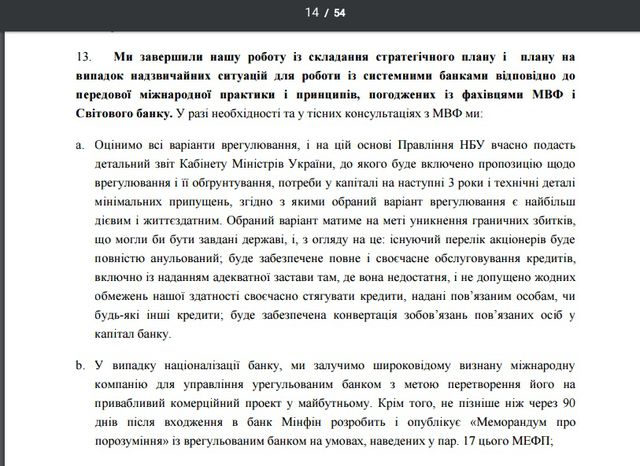 ...у випадку націоналізації банку, ми залучимо широковідому визнану міжнародну компанію для управління урегульованим банком з метою перетворення його на привабливий комерційний проект у майбутньому. Крім того, не пізніше ніж через 90 днів після входження в банк Мінфін розробить і опублікує «Меморандум про порозуміння» із врегульованим банком на умовах, наведених у пар. 17 цього МЕФП".