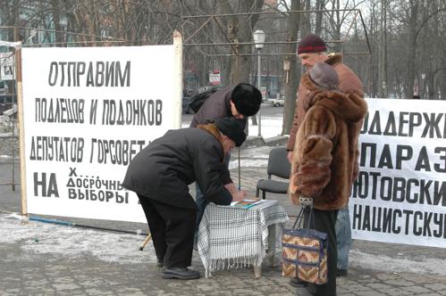 27 февраля витренковцы пикетировали сессию городского совета с требованием, что бы депутаты горсовета отмежевались от разрушителей памятника и осудили их действия. Но городской совет, состоящий из депутатов ВО "Свобода", БЮТ, "Наша Украина", "Фронт змин", "Удара" проигнорировали наши требования. Депутатов городского совета мы пропустили через плакаты: "Коррупционеру А.Жарому - нары, а не кресло горисполкома" (Жарый - заместитель мера города от партии "Удар"), "Городской совет - это скопище бандеровской падали, предателей-энурезников, могильщиков города", "Отправим подлецов и подонков депутатов горсовета на х.... на досрочные выборы" и др.